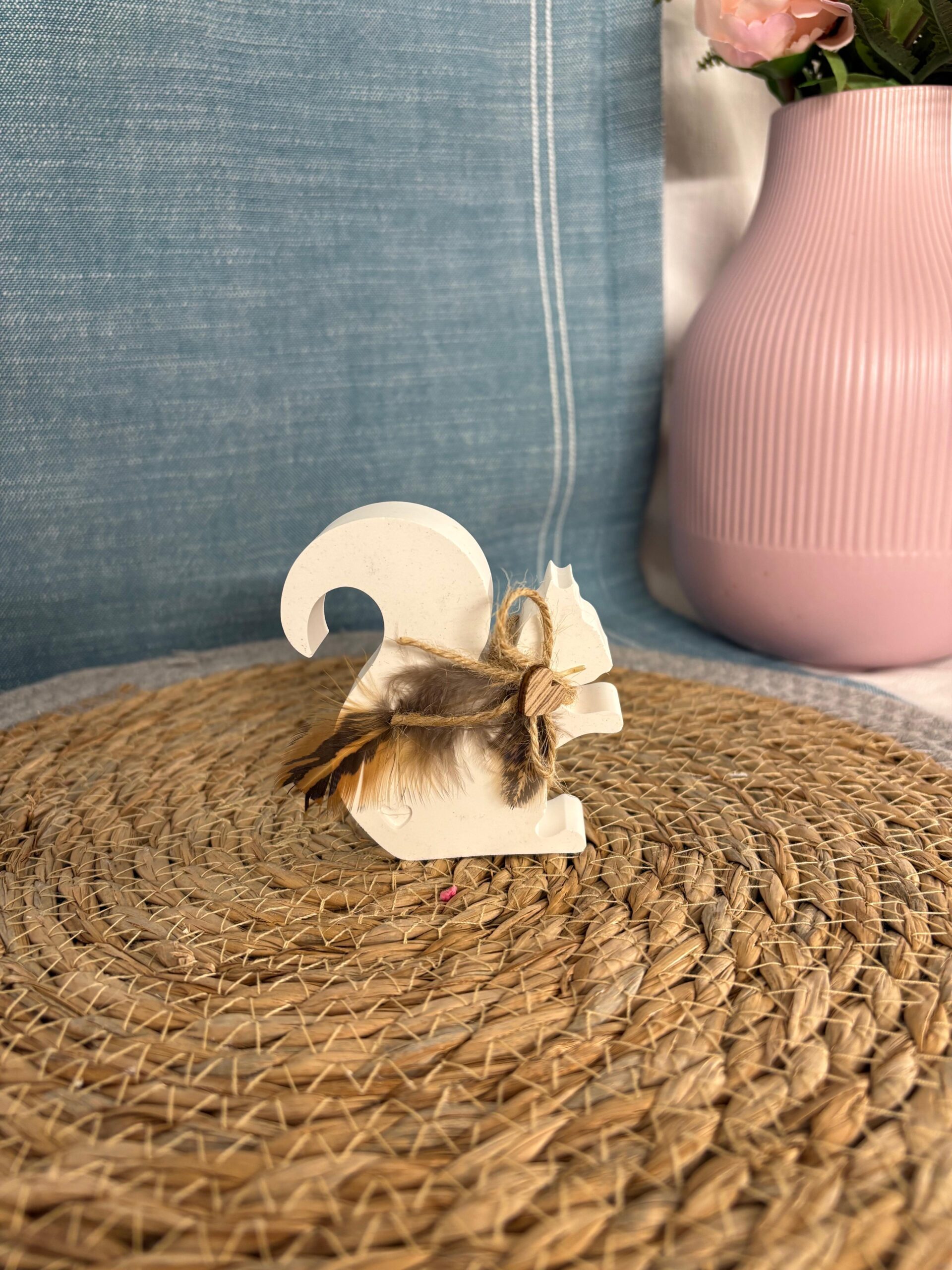 Dieses liebevoll gestaltete Eichhörnchen aus Raysin ist eine stilvolle Dekoration für dein Zuhause. Die schlichte Form wird durch eine natürliche Kordel mit dekorativer Feder ergänzt und verleiht dem kleinen Aufsteller einen warmen, natürlichen Look.
