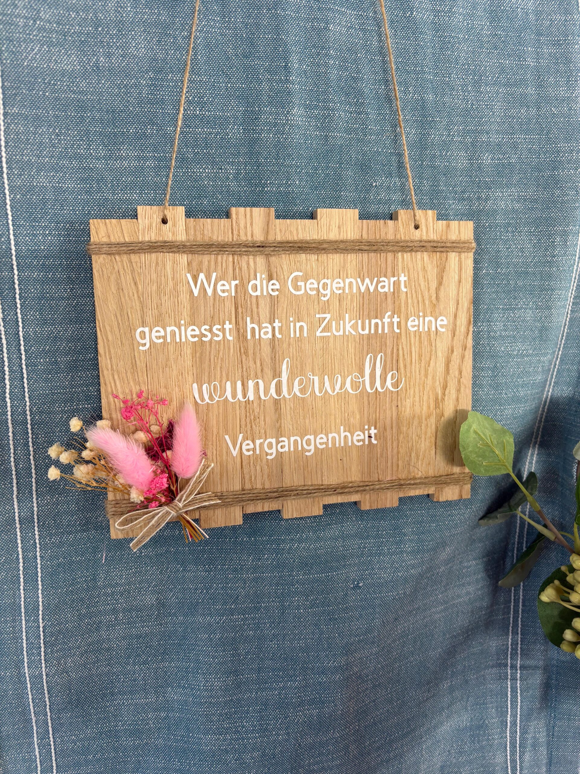 Der aufgebrachte Spruch macht den Aufhänger zu einem besonderen Blickfang und sorgt für eine gemütliche Atmosphäre im Wohnbereich, Flur oder Eingangsbereich. Die feinen Trockenblumen setzen dabei einen romantischen und dekorativen Akzent.