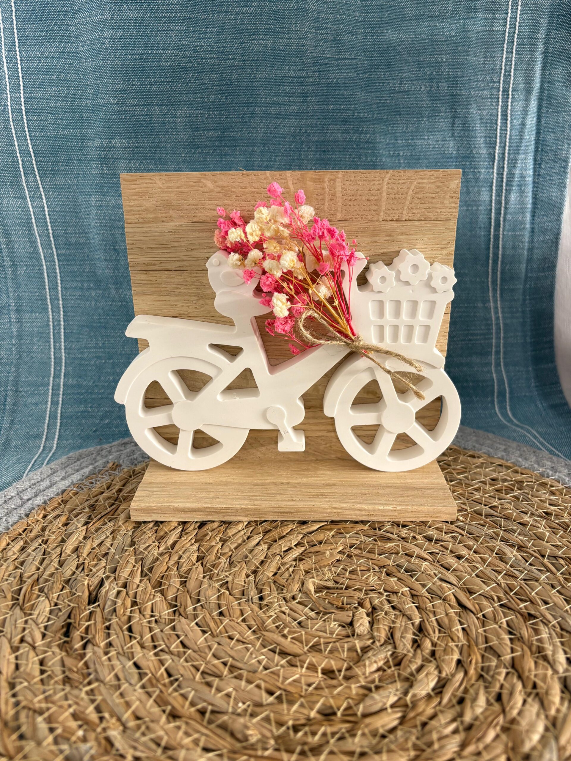 Dieser liebevoll gestaltete Aufsteller verbindet schlichte Eleganz mit einem Hauch von Romantik. Das filigrane Fahrrad aus Raysin wird durch zarte Trockenblumen stilvoll ergänzt und auf einem natürlichen Holzsockel perfekt in Szene gesetzt.