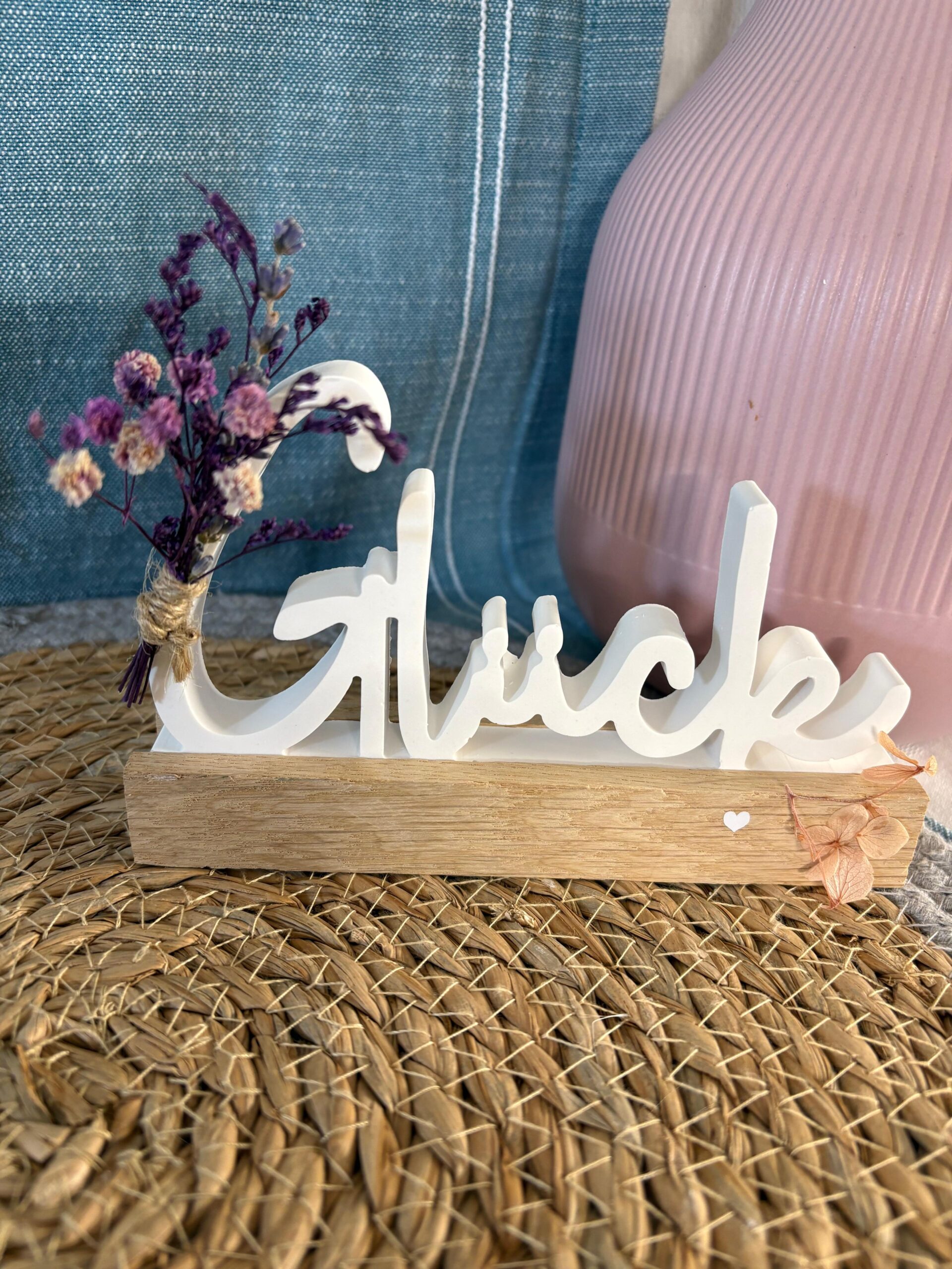 Dieser stilvolle Holzaufsteller mit dem Schriftzug „Glück“ bringt eine warme und positive Atmosphäre in jedes Zuhause. Der natürliche Holzsockel kombiniert mit dem modernen Schriftzug und den liebevoll arrangierten Trockenblumen macht diese Dekoration zu einem echten Blickfang.