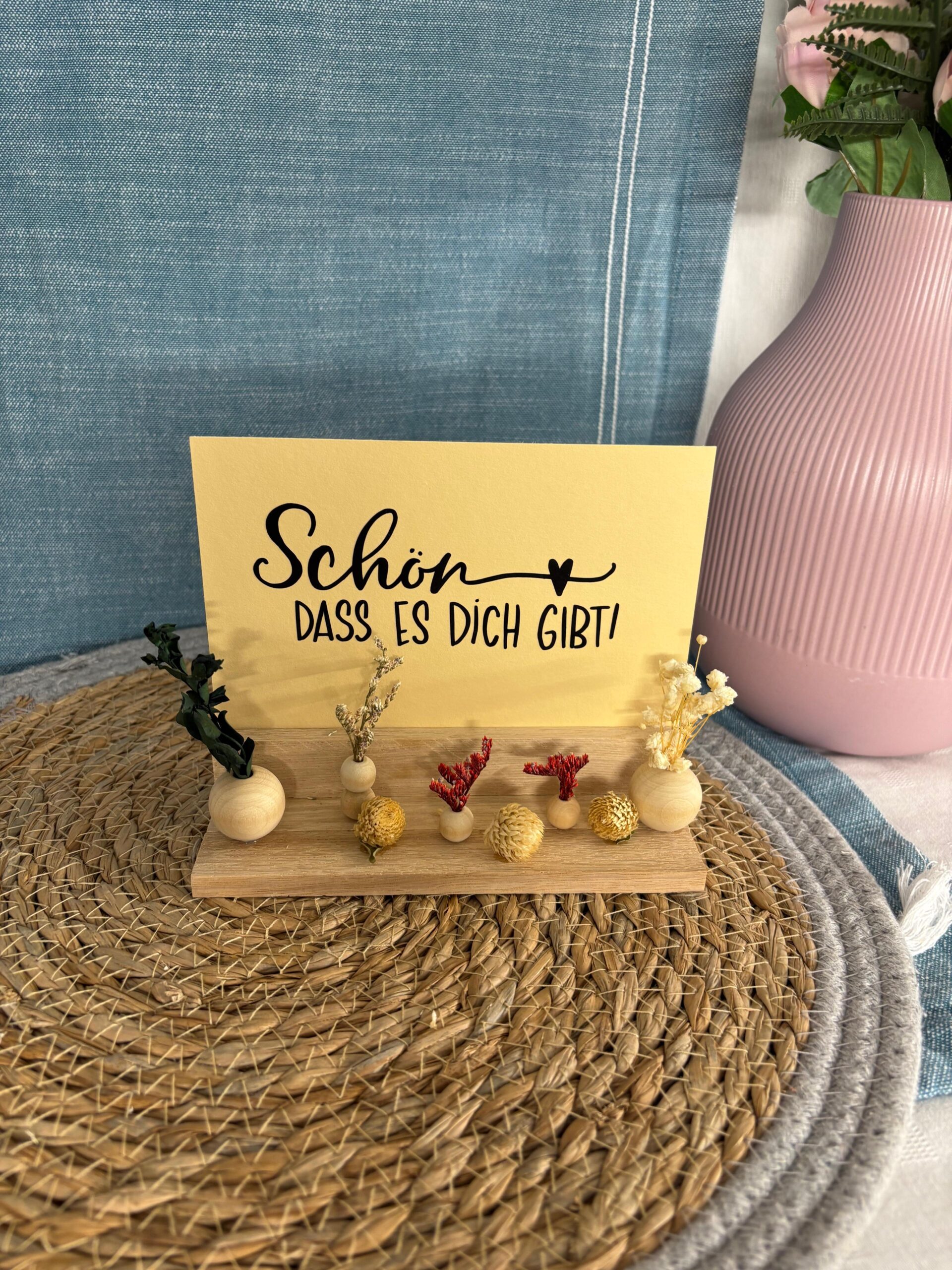 Ein liebevoller Holzaufsteller mit zarten Trockenblumen in kleinen Vasen – perfekt als besondere Dekoration oder als persönliches Geschenk für einen lieben Menschen.