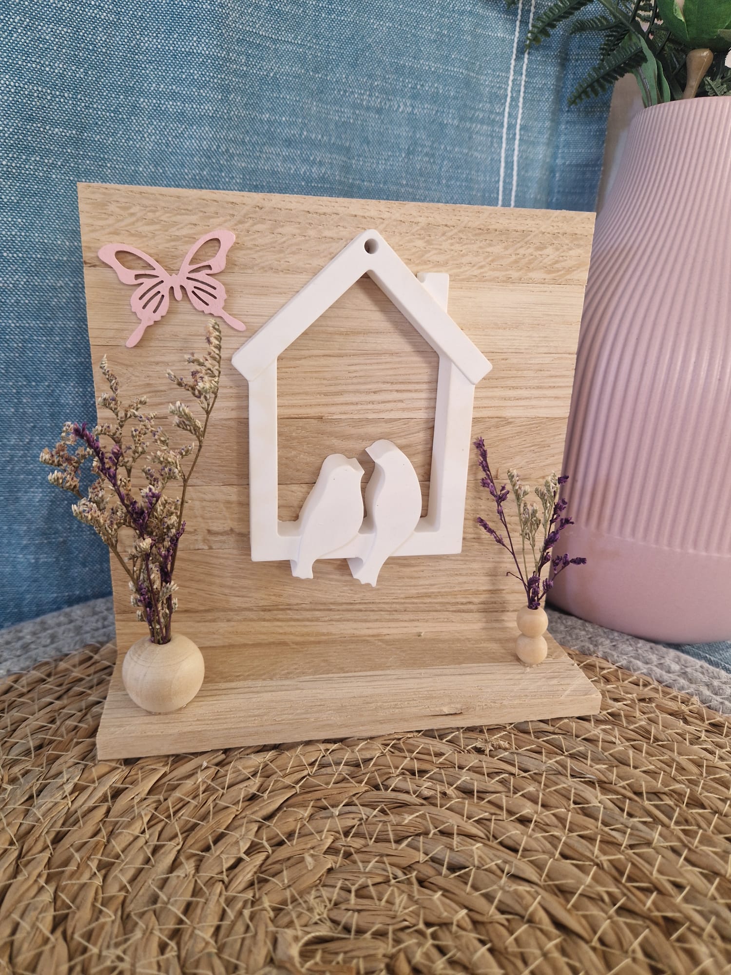 Dieser handgefertigte Holzaufsteller bringt Wärme, Ruhe und Stil in jeden Raum. Das minimalistische Design mit den zwei Vögeln im Haus steht für Geborgenheit, Liebe und Zusammenhalt – perfekt als Geschenk oder für dein eigenes Zuhause.