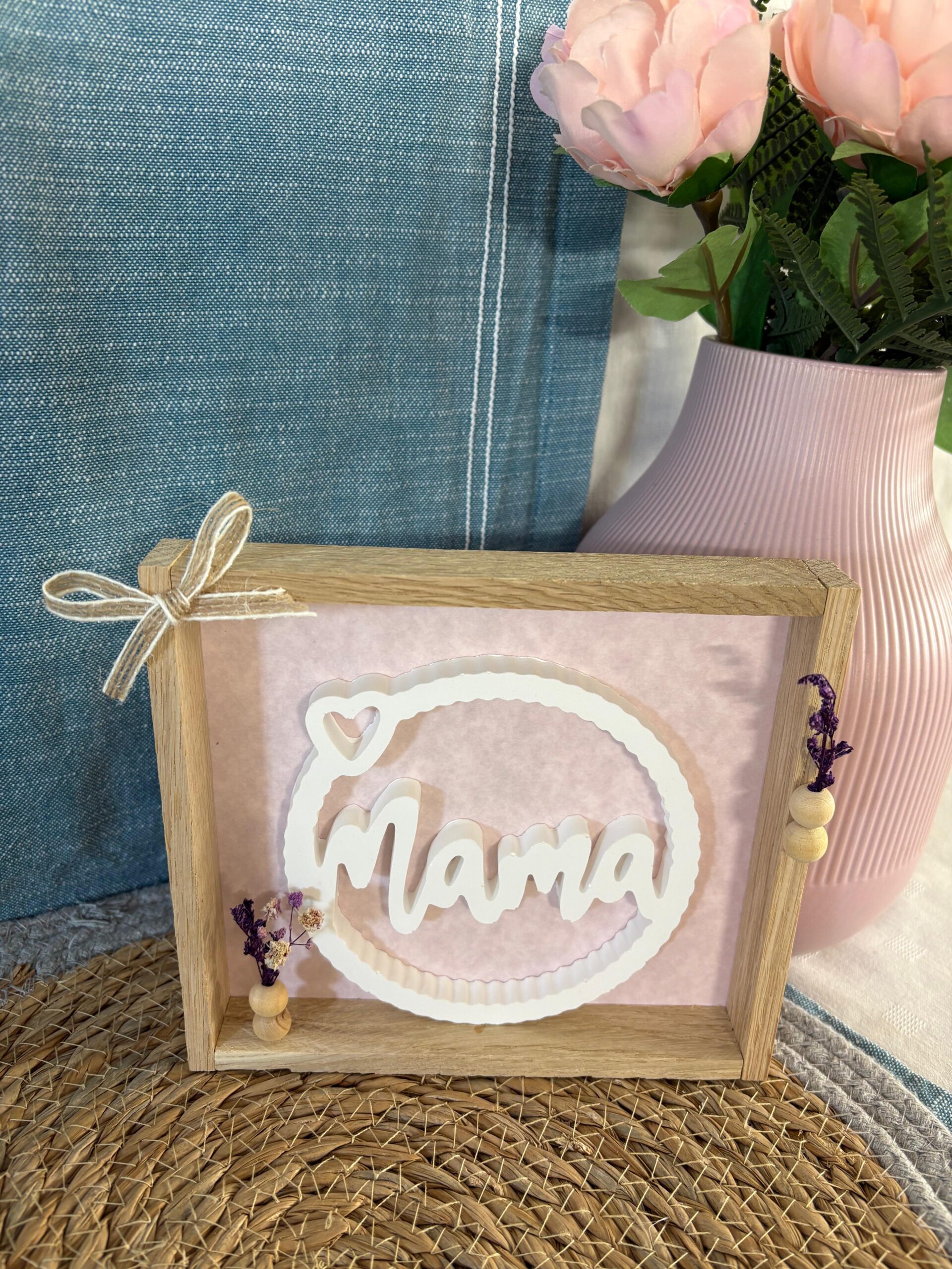 Das moderne Schriftmotiv „Mama“ steht im Mittelpunkt des Designs und macht den Aufsteller zu einem wunderschönen Geschenk zum Muttertag, Geburtstag oder zur Geburt eines Kindes.
