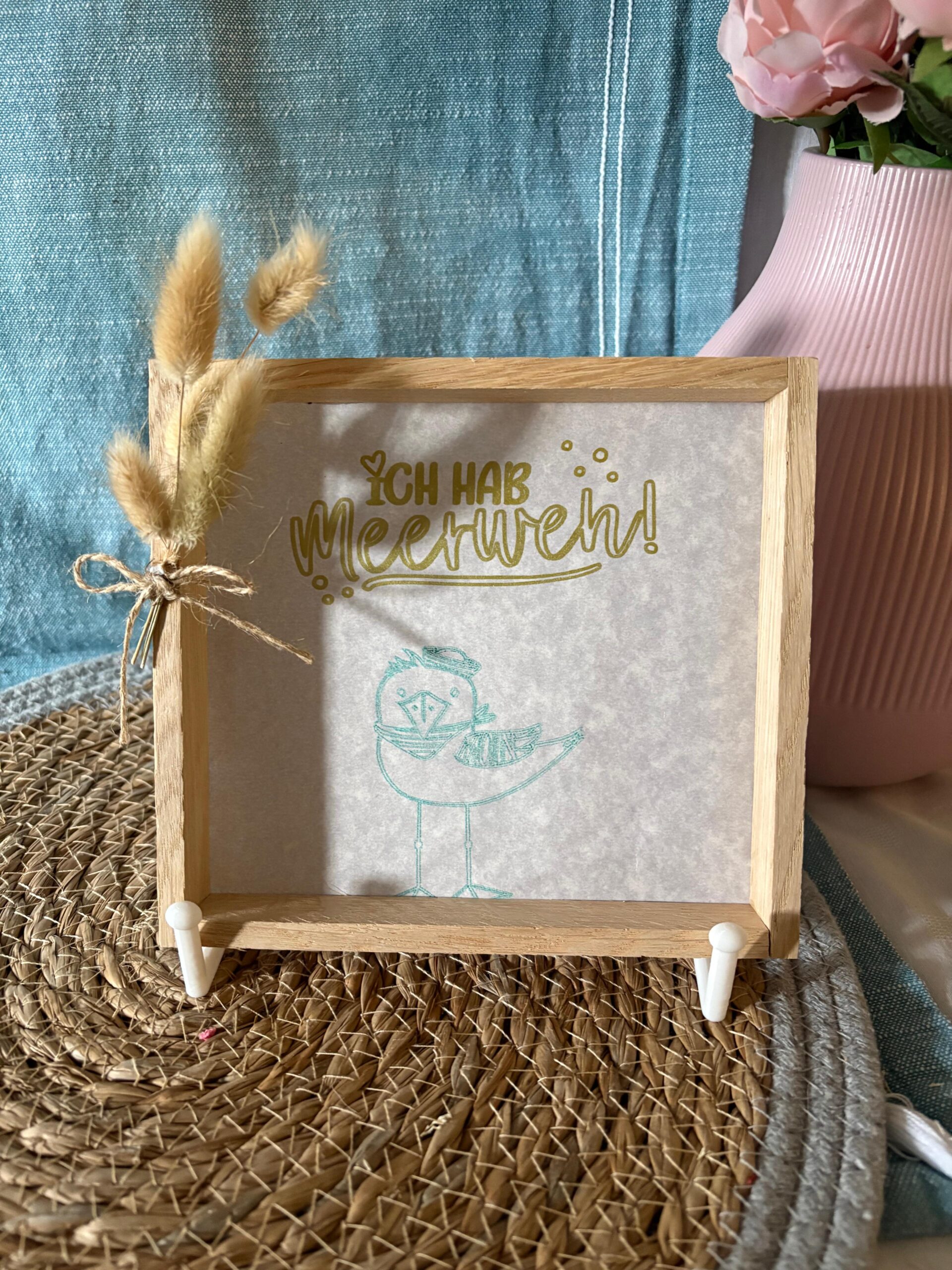 Dieser dekorative Holzrahmen bringt sofort Urlaubsgefühl und Meeresstimmung in dein Zuhause. Mit dem liebevollen Schriftzug „Ich hab Meerweh“ und dem niedlichen Möwenmotiv erinnert er an Strandtage, frische Meeresluft und die Sehnsucht nach dem Meer.