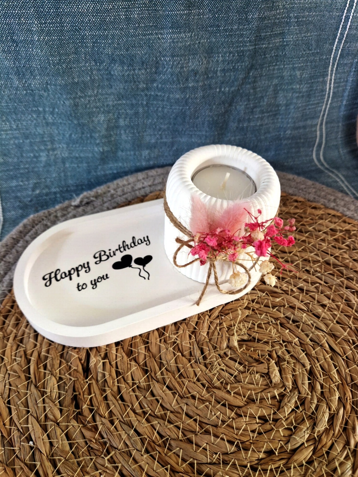 Dieses liebevoll gestaltete Set aus Raysin Teller und passendem Kerzenhalter ist ein wunderschönes Geschenk zum Geburtstag. Verziert mit feinen Trockenblumen und einem stilvollen Schriftzug sorgt es für eine besondere, dekorative Note und bringt sofort eine warme, persönliche Atmosphäre in jedes Zuhause.