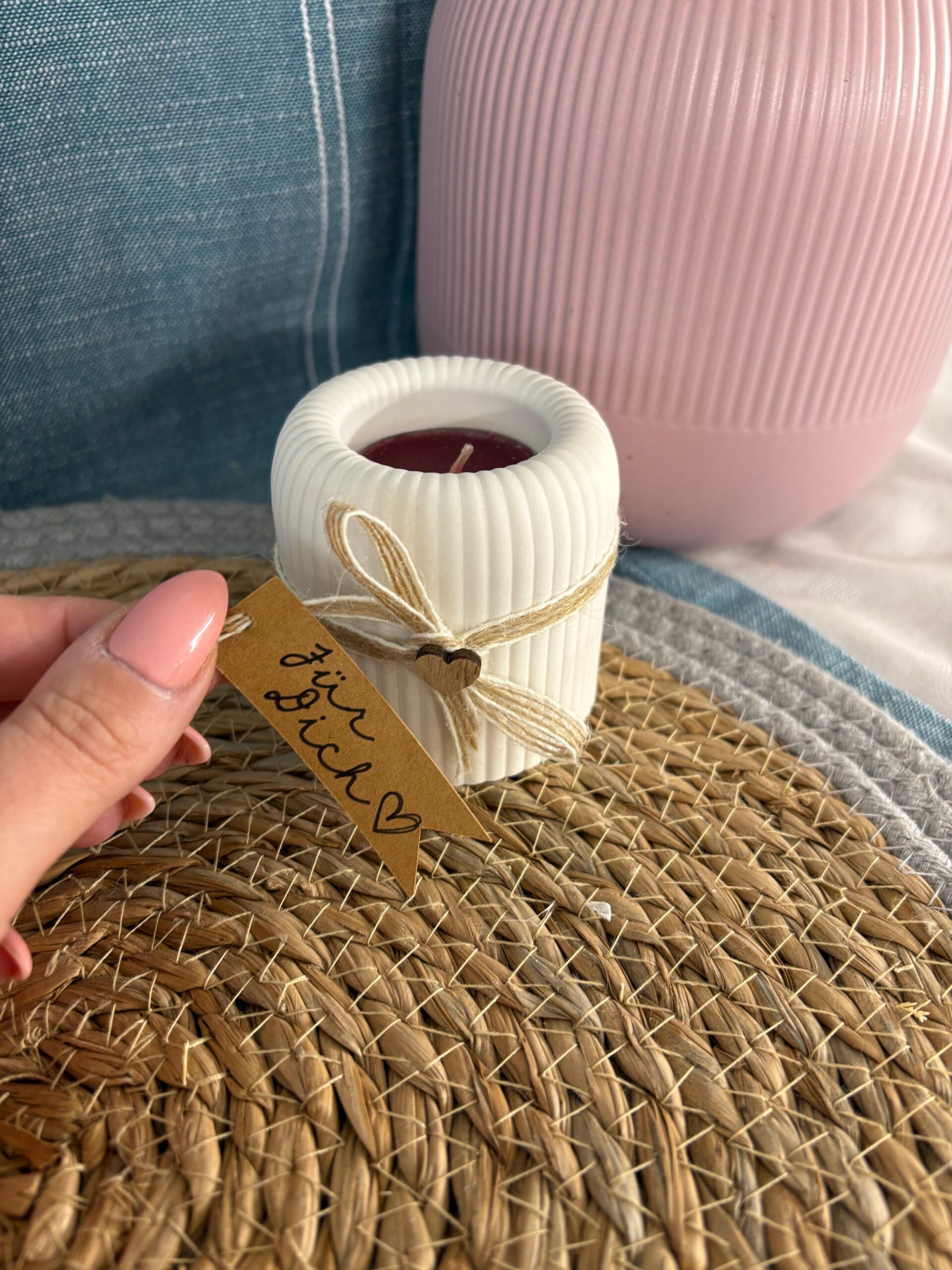 Dieser stilvolle Teelichthalter überzeugt durch sein modernes, geriffeltes Design und seine natürliche Dekoration. Verziert mit einer Kordelschleife und einem kleinen Holzherz wird er zu einem besonderen Blickfang in jedem Zuhause.