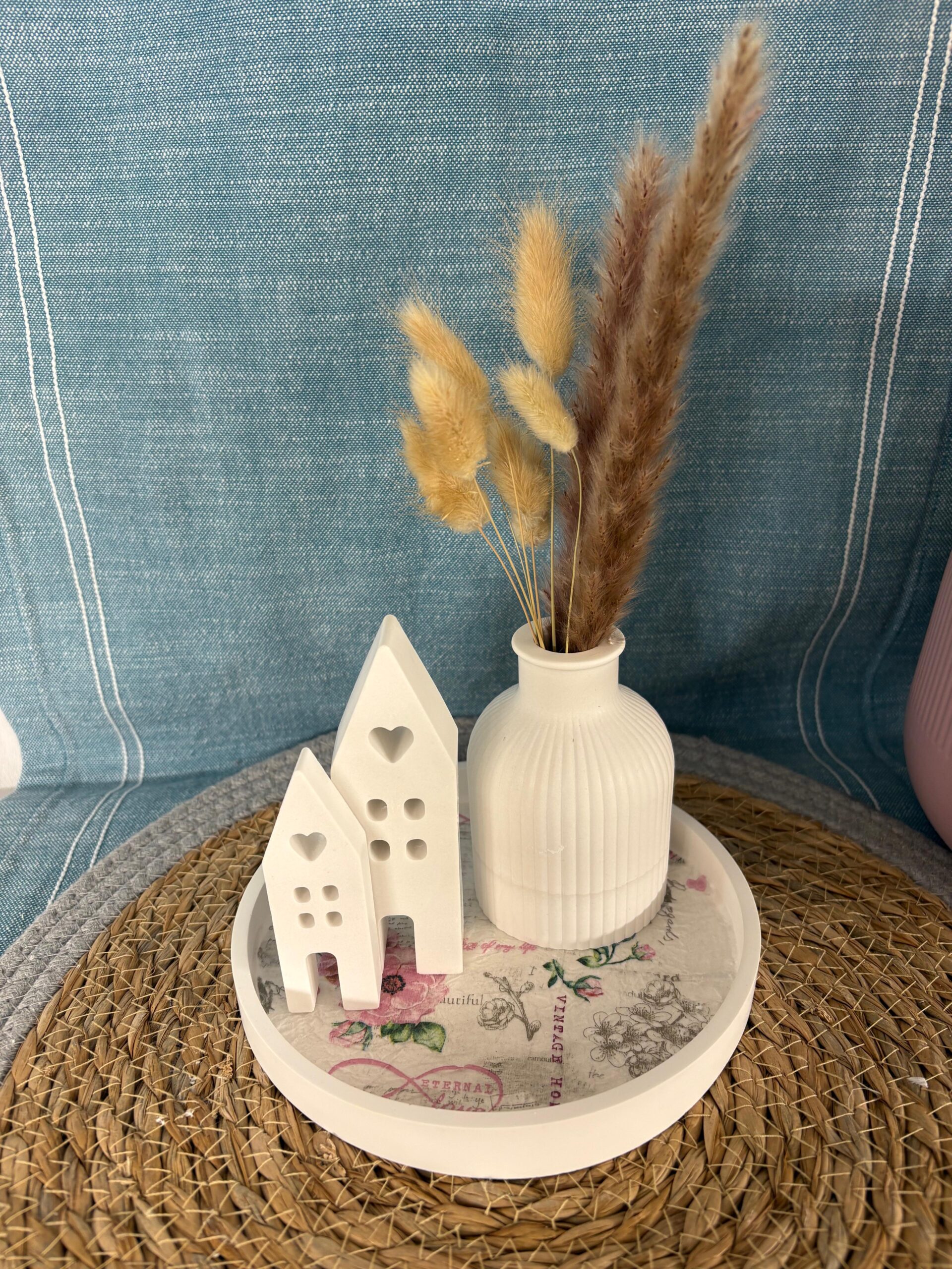 Die Kombination aus zarten Häuschen aus Raysin, einer Vase mit Trockenblumen und dem dekorativen Teller schafft ein modernes, zugleich zeitloses Arrangement – ideal für Wohnzimmer, Flur, Schlafzimmer oder als Geschenk.